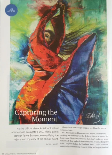 Much like Manly tries to corral the inspiration that eventually manifests in her paintings, her passion for art was also once elusive but now has a firm hold over her. Manly’s pieces certainly aren’t new to the scene. For years they’ve appeared throughout South Louisiana, hanging in places like The Roosevelt Hotel in New Orleans, River Ranch’s City Club and the St. Jude Acadiana Dream Home. In 2014, she was the Festival International Poster Artist.
